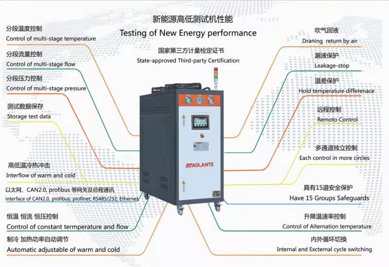 新能源動(dòng)力電池液冷測(cè)試系統(tǒng)是為了電動(dòng)車使用安全、動(dòng)力持久研發(fā)的測(cè)試設(shè)備。深圳市奧蘭特機(jī)械動(dòng)力電池測(cè)試系統(tǒng)的具體功能如圖: